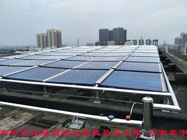 南陽世紀(jì)星酒店:采用太陽能與原來燃氣鍋爐相結(jié)合,日產(chǎn)熱水量約為25t。