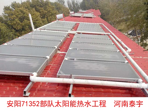 安陽71352部隊(duì)太陽能熱水工程:該圖為安陽71352部隊(duì)太陽能熱水工程,該項(xiàng)目主要提供集中洗浴熱水,采用榮事達(dá)平板集熱器與電輔助加熱相結(jié)合,共有六個(gè)系統(tǒng),單個(gè)系統(tǒng)熱水量日供4T左右,節(jié)能效果顯著!