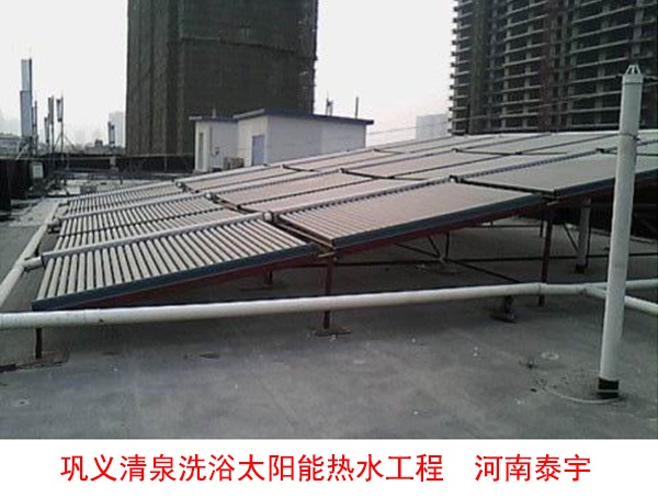 鞏義清泉洗浴太陽能熱水工程:該圖為鞏義清泉洗浴太陽能熱水工程,該項目主要采用力諾真空管集熱器與原有鍋爐相結合,單個系統(tǒng)日供熱水量約為10T左右,節(jié)能效果顯著!