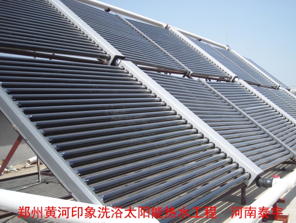 鄭州黃河印象洗浴太陽(yáng)能熱水工程:該圖為鄭州黃河印象洗浴太陽(yáng)能熱水工程,該項(xiàng)目主要采用力諾真空管集熱器與原有水源熱泵相結(jié)合,單個(gè)系統(tǒng)日供熱水量約為8T左右,節(jié)能效果顯著!