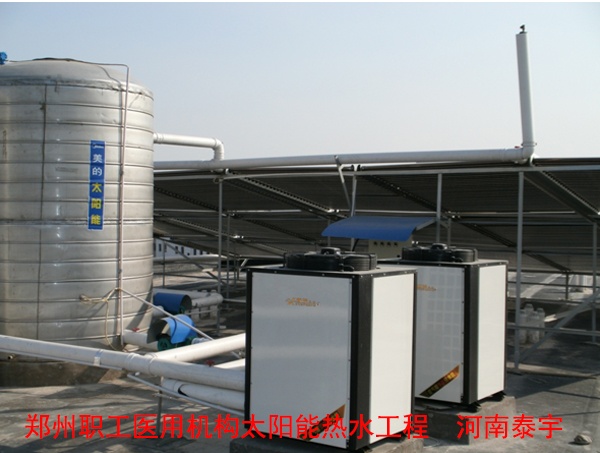 鄭州職工醫(yī)用機(jī)構(gòu)太陽能熱水工程:該圖為鄭州職工醫(yī)院太陽能熱水工程,該項(xiàng)目主要采用美的太陽能集熱器與空氣能熱泵相結(jié)合,單個(gè)系統(tǒng)日供熱水量約為8T左右,節(jié)能效果顯著!