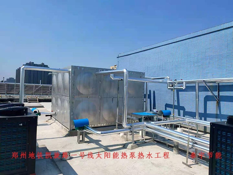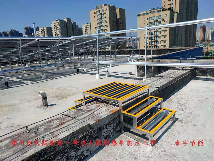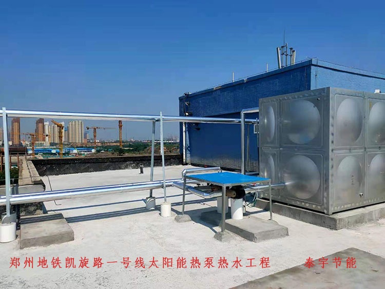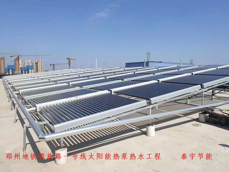 鄭州地鐵一號(hào)線凱旋路熱水工程由太陽(yáng)能和空氣能組成,太陽(yáng)能集熱面積約為300平方,主要滿足食堂用水及列車員住宿樓生活熱水所需。晴好天氣時(shí),日產(chǎn)標(biāo)準(zhǔn)洗浴熱水不低于20T,強(qiáng)冷及陰雨天采用兩臺(tái)10P空氣能熱泵作為補(bǔ)充來(lái)滿足全年熱水所需。