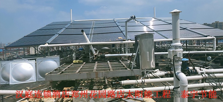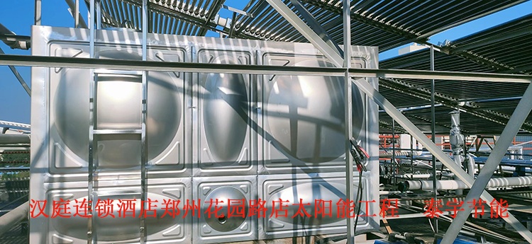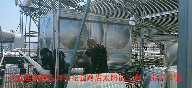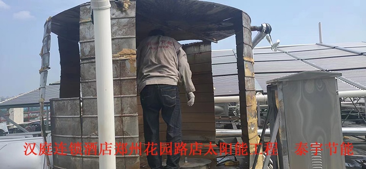 漢庭連鎖酒店鄭州花園路店太陽能保溫水箱更換中。該太陽能熱水工程已運行12年之久,舊的圓水箱由于漏水已下崗,新的方水箱已上任。整個太陽能系統(tǒng)運行12年之久,太陽能完好,水箱基礎完好,保溫水箱更換后,一切運行正常。